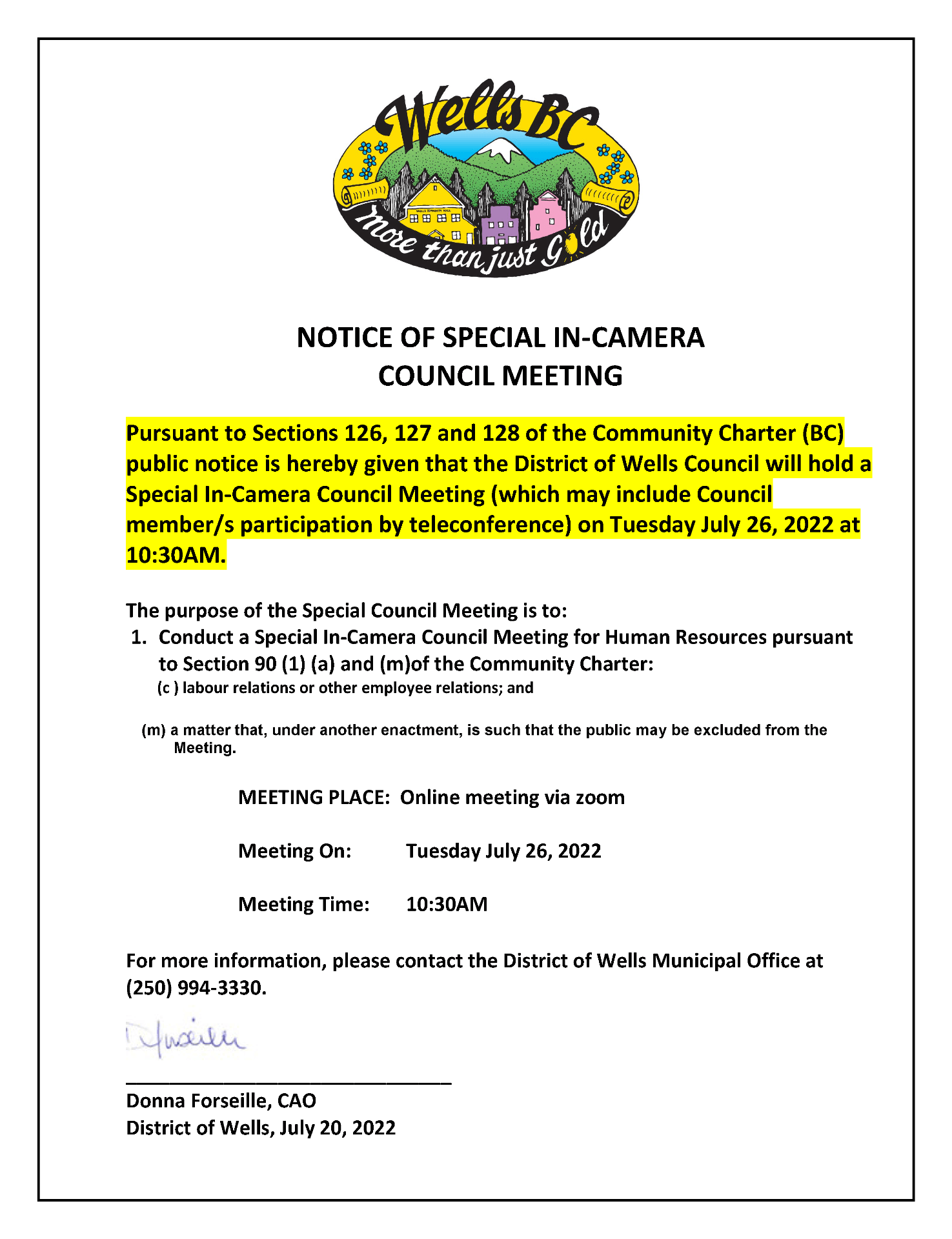 Wells - Special Closed Council Meeting via Zoom on Tuesday, July 26th at 10:30am. Meeting to be closed under Section 90(1c - labour/employee relations and 1m - a matter under another provincial law that the public may be excluded from the meeting) of the Community Charter. View the closed meeting notice here